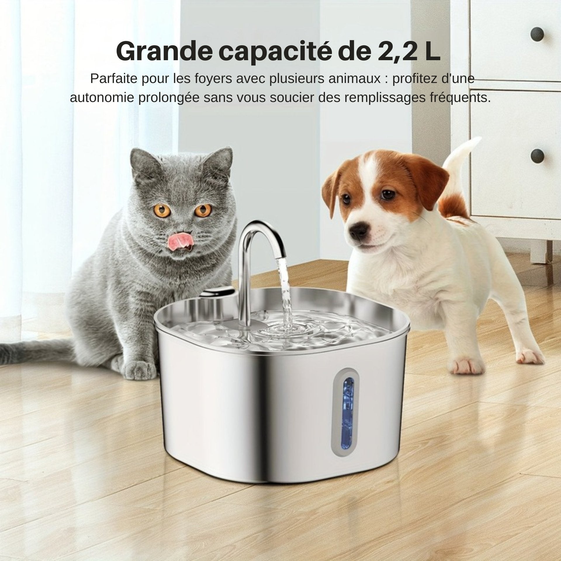 La fontaine 2.2L en acier inoxydable assure un écoulement continu et silencieux pour une hydratation optimale de votre chat ou petit chien.